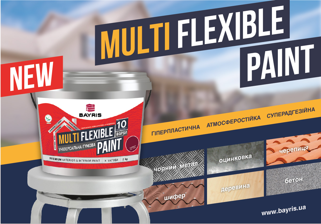 Група компаній «BAYRIS» представляє новий продукт – «Multi Flexible Paint» Універсальну гумову фарбу. Даний продукт придатний для внутрішніх та зовнішніх робіт, при декоративно-захисному фарбуванні цегли, попередньо ґрунтованого чорного металу, природного каменю, деревини, а також поверхонь, які були раніше пофарбовані масляними чи алкідними фарбами. Фарбу також, можна використовувати, для фарбування оцинкованого металу, шиферу, «ондуліну», черепиці та інших фібро- та азбестоцементних виробів.