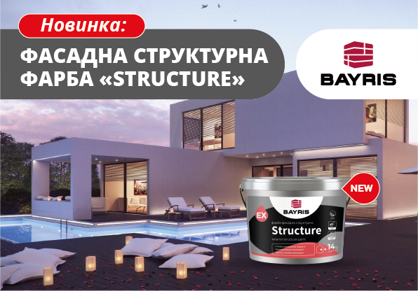 Чергова новинка у фасадному пакеті продуктів ТМ «Bayris» – фарба фасадна структурна «Structure» TM «Bayris». Даний продукт ідеально підходить для створення тонкошарових декоративних ефектів на різних поверхнях. Структурна фарба ТМ «Байріс» використовується для декоративно – захисного оздоблення фасадів та інтер’єрів будинків, а також для приміщень, які піддаються інтенсивному зовнішньому впливу. Фарбу наносять на підготовлені основи із цементу, гіпсу, гіпсокартону, бетону, на цементно-вапняні, полімерні, полімер – цементні штукатурки та для оновлення вже існуючих лакофарбових покриттів. Фарба зручно наноситься, добре вкриває поверхню та приховує дрібні недоліки поверхні. Одержане покриття біле, рельєфне, середньозернисте (розмір частинок S2 - менше 300 мкм), товщина сухої плівки Е3 – не менше 100 мкм), стійке до багаторазового миття неабразивними миючими засобами, а також до появи водоростей, плісняви та грибків. Екологічні переваги підтверджено згідно з вимогами міжнародного стандарту ДСТУ ISO 14024.