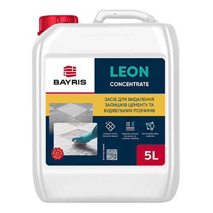 Засіб для видалення залишків цементу та будівельних розчинів «LEON» Концентрат ТМ "Байріс" («ЛЕОН» TM «Bayris») -  це професійний концентрований продукт призначений для видалення залишків різних типів цементних розчинів, сухих будівельних сумішей, вапна, іржі тощо. Ідеально підходить для прибирання після ремонту, очищує плитку після фугування. Підходить для очищення керамічної, кам'яної, клінкерної плитки, скляних, лакованих та інших кислотостійких поверхонь. Усуває побутові забруднення: бруд, осад та плями, що утворилися з солей, які містяться у воді. Придатний для застосування як всередині, так і ззовні будівель.